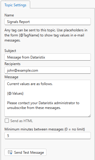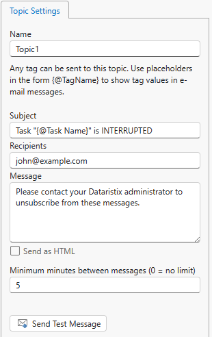 In this example a task state is monitored and an e-mail message is sent when the task changes to the “Interrupted” state. An e-mail topic with the following settings is configured. A placeholder in the subject is used for task name substitution.