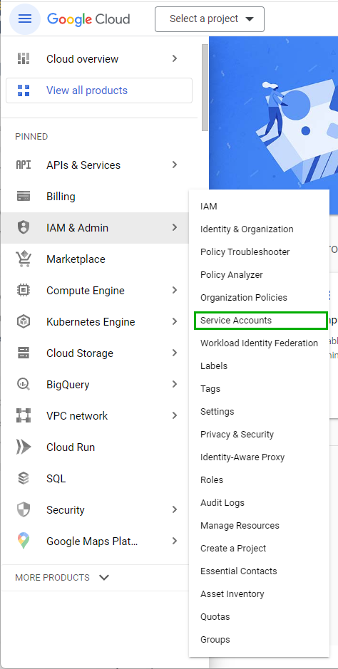 - Within the Google Cloud Console (https://console.cloud.google.com/), select “IAM & Admin / Service Accounts”.
