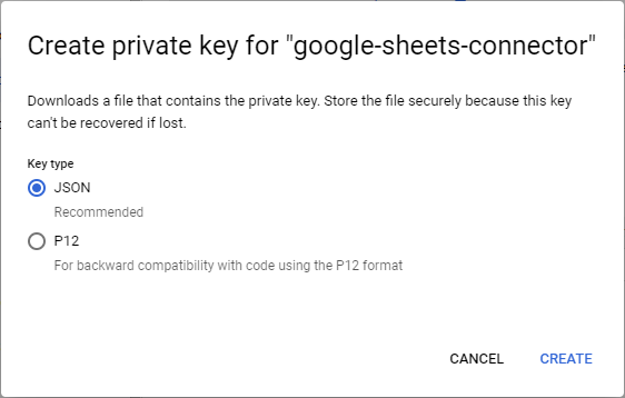 7. In the dialog, select “JSON” as the key type, then click “Create”. This will download a key file onto your computer for use with the Google Sheets Connector. Keep this file in a safe place.