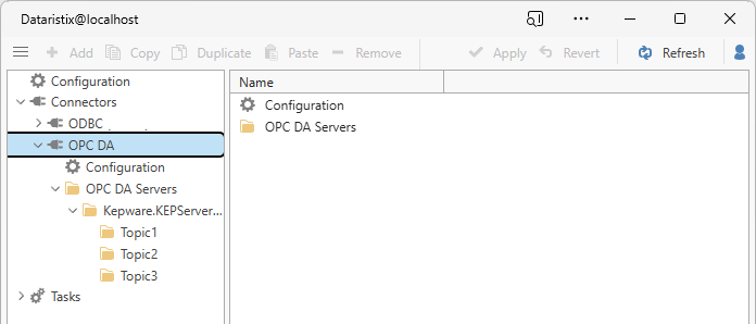 After installation, you’ll find the OPC DA Connector listed as “OPC DA” in the Dataristix main application. The navigation tree shows two top level nodes for the OPC DA connector: “Configuration” is used to import Rensen OPC Office Link data group files and the “OPC DA Servers” node is used to configure OPC DA Servers you want to connecto to.