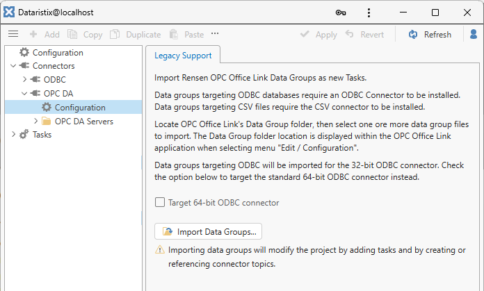 The Connector for OPC DA supports importing Rensen OPC Office Link data group files. Data group files will be converted into OPC DA connector topics, CSV connector topics, ODBC connector topics, and tasks that define the dataflow between them.